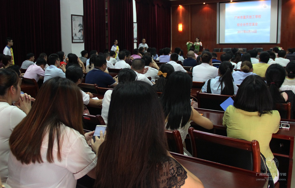 杨长生副校长介绍了我校在推进校企合作方面取得的显著成效;并就即将与广州兰诺汽车科技有限公司、富士电机(深圳)有限公司等九家企业签订校企合作进行了通报;满怀信心迎来“校企合作,携手共建,优势互补,互利双赢”的大好局面。随后,广东省人力资源研究会秘书长郭爱东做了重要讲话。他充分肯定了蓝天技工学校作为广州市高级技能人才的培养摇篮,以服务地方经济发展为己任,担负着为广州市和广东省市内外的企业培养大量技能型人才的重任,每年为企业和社会培养大量合适的人才。他指出:本次校企合作会的主题是:合作共赢,精准就业,创作价值。我们本着加强沟通,扩大交流,增进友谊的原则,与广大企业洽谈合作,谋划未来发展,促进校企共赢。