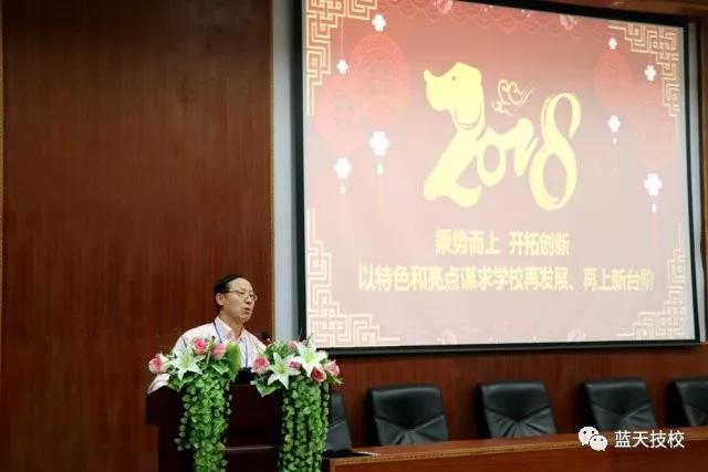 随后,罗荣禄校长作了主题为《乘势而上 开拓创新,以特色和亮点谋求学校再发展、再上新台阶》的工作部署,指出2017年是我校的“规范管理年”,也是学校完成“二五”规划的收官之年、颁布实施“三五”规划的开局之年。这一年来,蓝天技校大力弘扬“精益求精的工匠精神”,切实提升学校规范化、科学化管理水平,坚持走特色办学和内涵发展之路。2017年超额完成招生任务目标、顺利完成并通过ISO9001国际质量管理体系的建立与认证、隆重举办10年校庆及校园内技能节和艺术节的举办等,展现出全校教职工凝心聚力,奋发图强,重基础、强内涵、创品牌的“蓝天”精神,为实现2017年的工作目标和学校“三五”规划的全面实施奠定了坚实的基础。