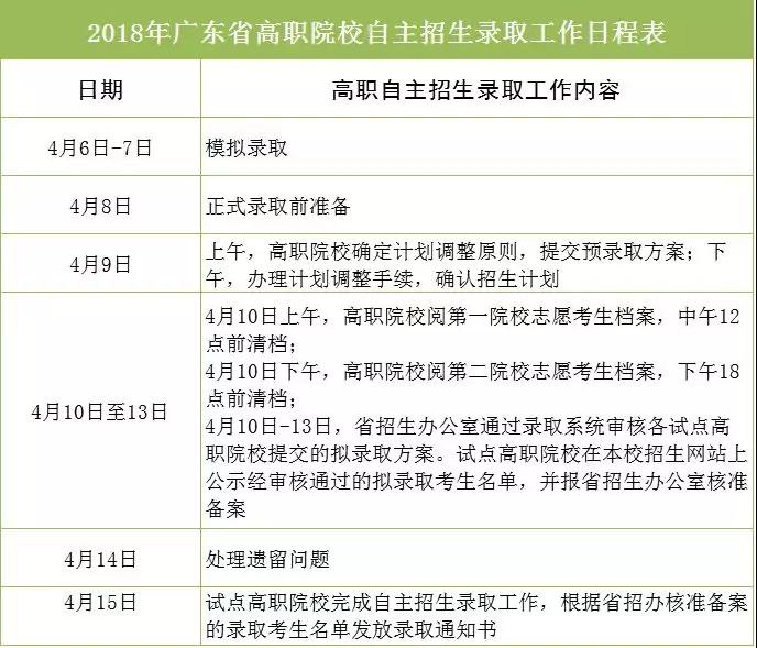 模拟录取时间为4月6日-8日,录取时间为4月9日-13日。具体按《广东省2018年高职院校自主招生录取工作日程表》执行。