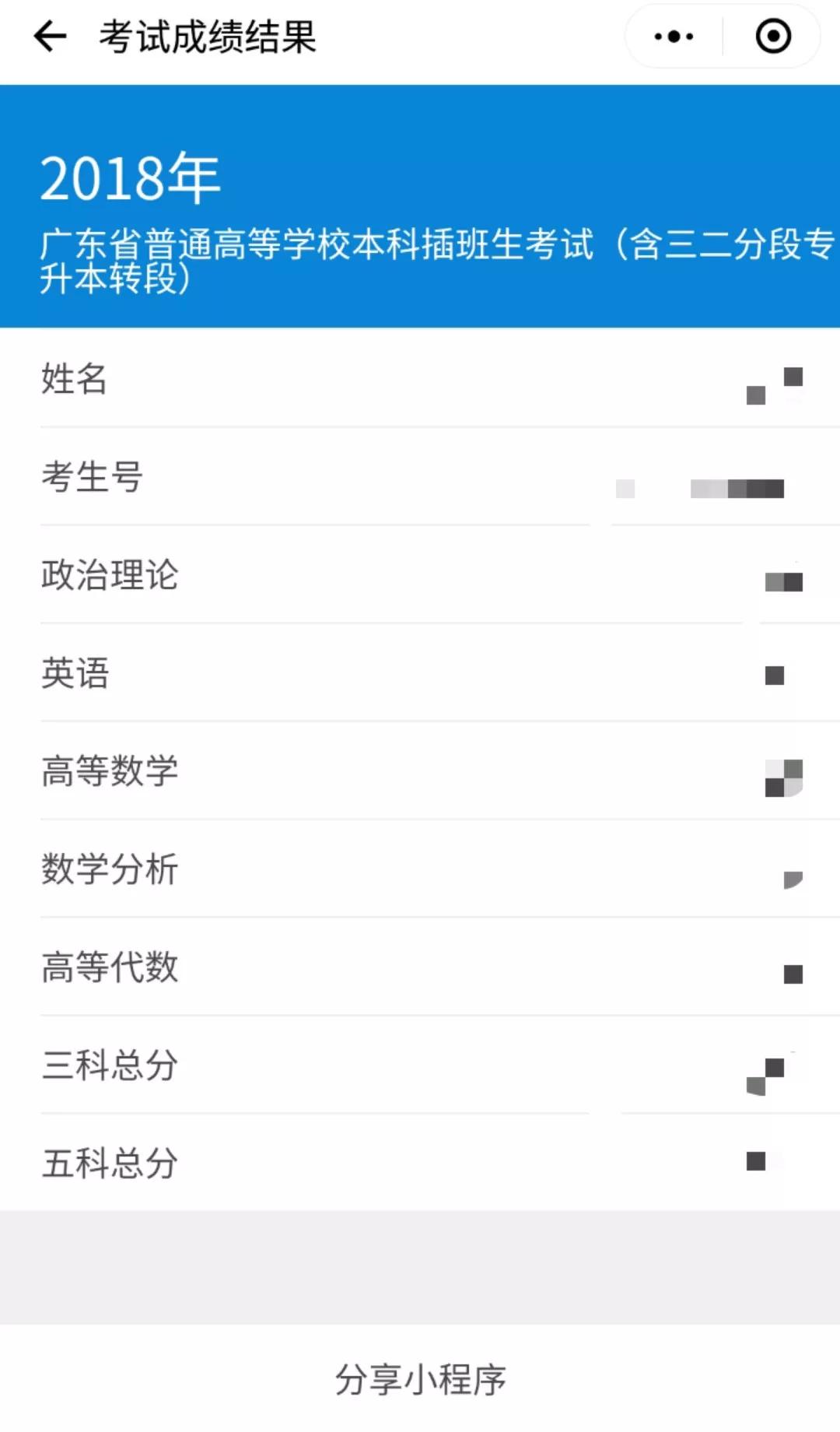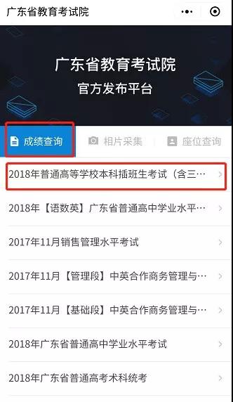 点击“小程序”后,会跳至此界面。选择“成绩查询”--“2018年普通高等学校本科插班生考试(含三二分段专升本转段)成绩查询”。