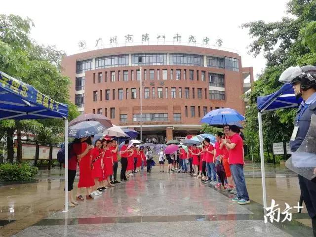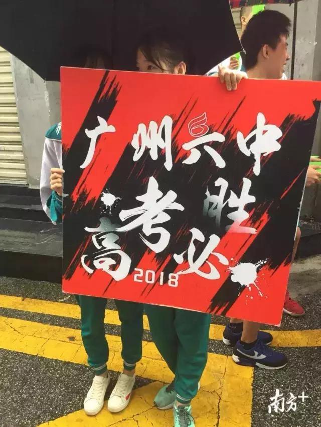 【广州六中】门口的六中高一高二学子在雨中手举标语,高喊加油口号:“六中六中,谁与争锋。放手一搏,威震全国。”(实习生 郑慧梓)
