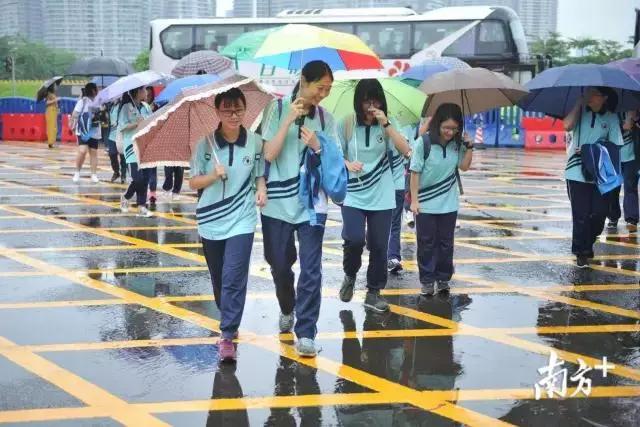 【佛山三中高中部】真好,雨暂时停了!迈着自信的步伐,“00后”高考考生笑着走进考场。(戴嘉信)