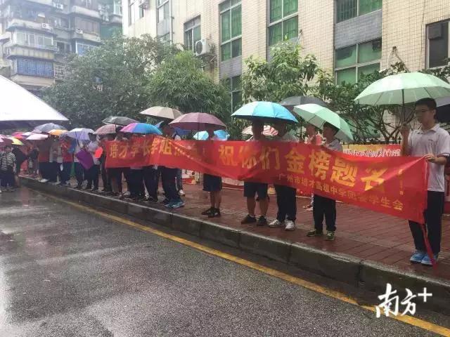 【广州六中】培才和六中的学弟学妹们在六中校门前拉起横幅为高考的学长学姐加油。(实习生 郑慧梓)
