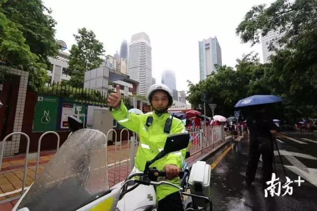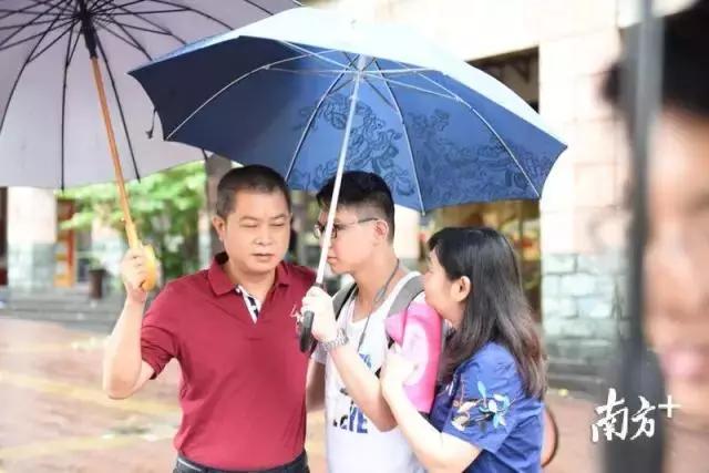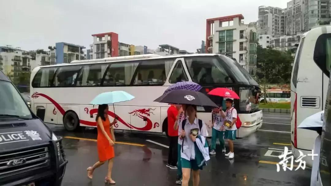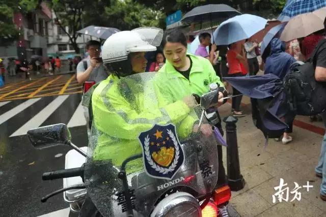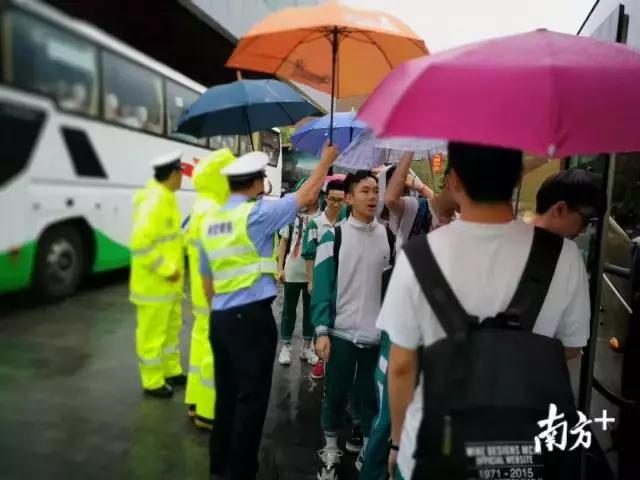 在广东省实验中学顺德学校,顺德警察正在为赴考的考生打伞,护送他们上车。(蒋晓敏)