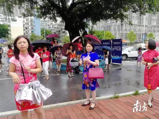 【广州市第八十九中学】广州市第八十九中学门口,不少送考的妈妈特意穿上了旗袍,寓意“旗开得胜”。(马立敏)