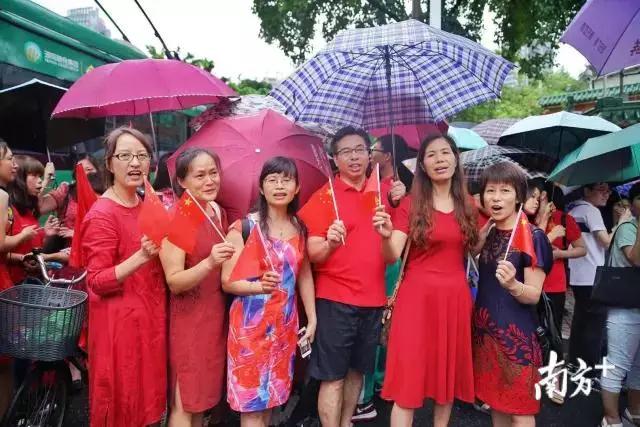 【执信中学】许多家长穿着红衣服拿国旗,希望孩子们“旗开得胜”。(张迪)