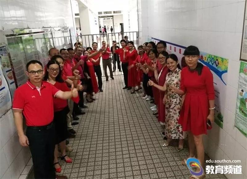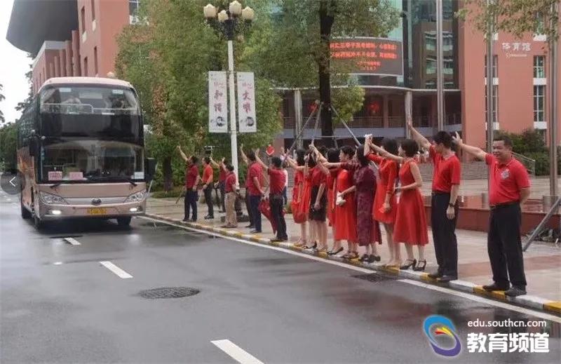 【广州市第八十九中学】广州市第八十九中学老师统一穿着大红色衣服,在校道排成两列和学生们击掌加油。(马立敏)