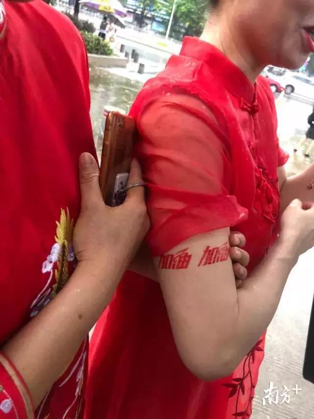 【珠海一中】左臂上贴的是“加油加油”,右臂上贴的是“必胜必胜”。耳朵上还有一匹“小黑马”样式耳钉,寓意着能超常发挥。有这样的妈妈考生一定感到很贴心很温暖呢!(董谦君)