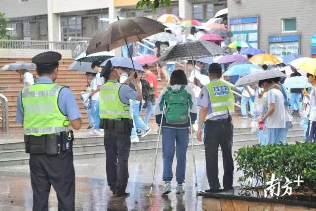 【佛山三中高中部】雨势渐大,一名学生拄着拐杖进入考点,警察叔叔贴心护着她进入考场。(朱苏娇 戴嘉信)