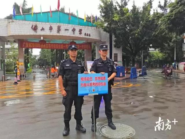 【佛山一中】高考之日,平时威猛彪悍的特警叔叔,也化身暖男,给学子送上祝福语。(刘丹萍)