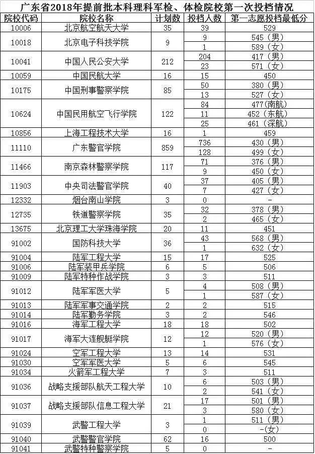 二是军检院校生源良好,部分院校尚有缺额。军检院校文科类考生专业绝大部分都能在第一志愿完成招生计划,只有陆军勤务学院、武警警官学院等少量院校尚存少量缺额;理科类考生专业大部分院校第一志愿即满档。国防科技大学、广东警官学院、中国人民公安大学生源比较火爆,其中,国防科技大学依然受到考生“追捧”,投档分数线高达568分,超过高分优先投档线68分。武警警官学院、南京森林警察学院、中国刑事警察学院等院校还有部分缺额。