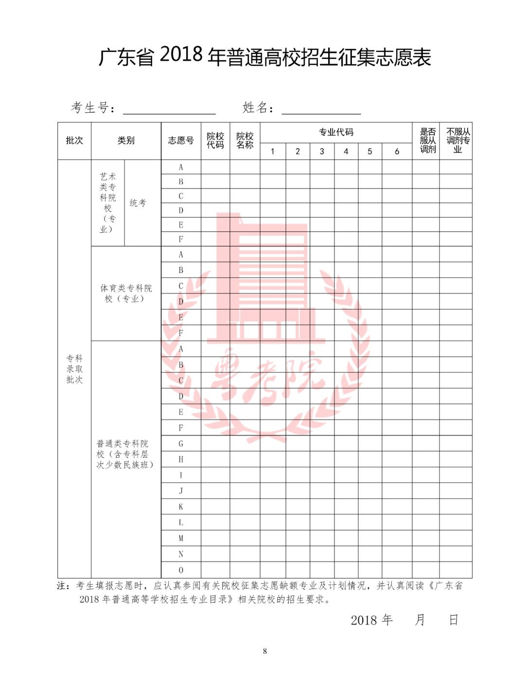 符合条件且有意参加征集志愿的考生,可重新填报志愿。参加征集志愿的考生填报征集志愿时,应认真阅读有关院校征集志愿缺额专业、计划情况及各院校招生章程对高考分数、身体条件的要求,并认真阅读《广东省2018年普通高等学校招生专业目录》相关院校及专业的招生要求。专科批次院校普通文理类(含专科院校少数民族班)考生可填报15所院校志愿,每个院校最多可填报6个专业志愿以及是否服从调剂选项和1个不服从调剂专业。音乐类(统考)、美术类(统考)、体育类征集志愿的考生,每人最多可填报A、B、C、D、E、F六所院校志愿,每个院校最多可填报6个专业志愿以及是否服从调剂选项和1个不服从调剂专业。