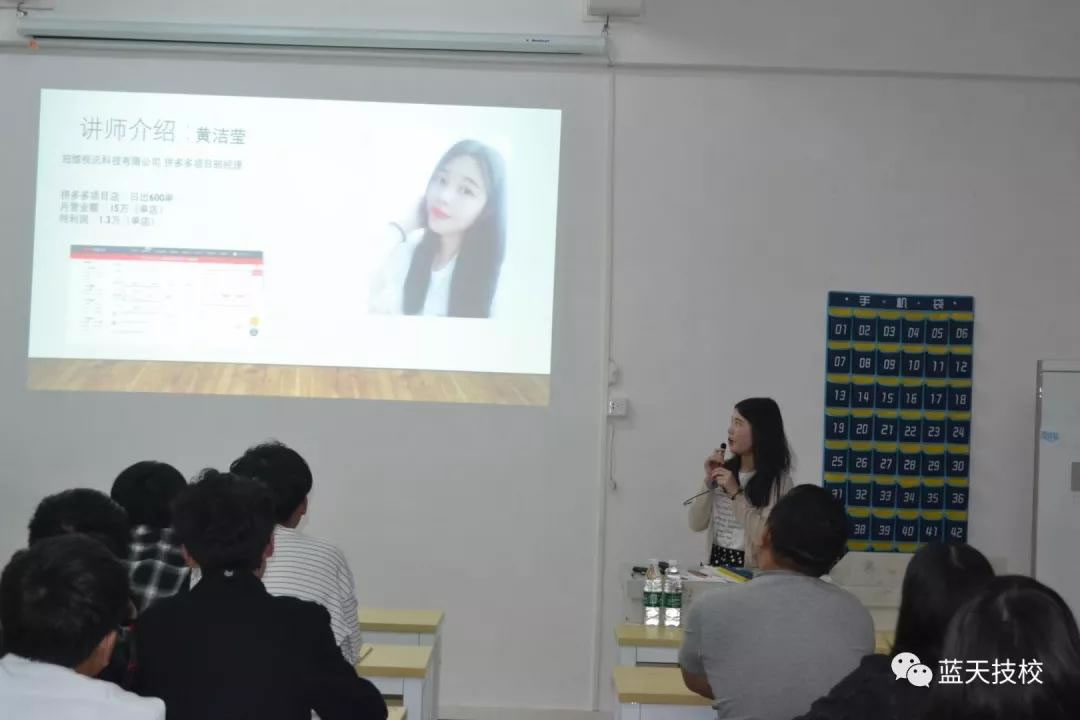 随后广州市冠维视讯科技有限公司的黄结莹项目经理,详细介绍了拼多多的运营规则、消费群体等方面的内容,还讲解和演示了拼多多运营技术和开店流程,激发了在场学生的创业热情。