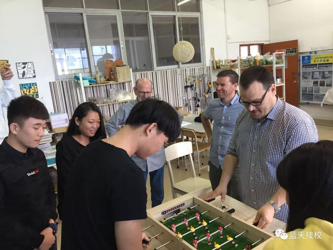 Steven Liddell团队还参观了我校室内设计工作室,对学生的工作室环境、学习模式、学生作品都给予了赞许。Steven Liddell和我校室内设计工作室的部分骨干同学进行了互动交流。讨论了同学们的专业发展和学生的目标,以及职业的规划,鼓励学生努力学习,继续进修!听闻室内工作室的足球游戏桌是我校2018年广州市技工院校创新作品一等奖作品,专家们表示非常有创意,开心的与同学们进行了足球游戏比赛。