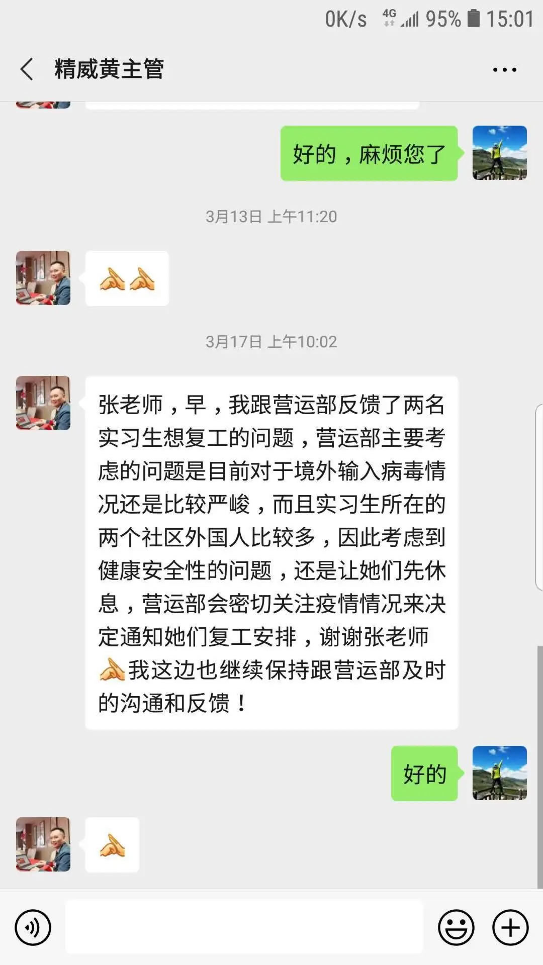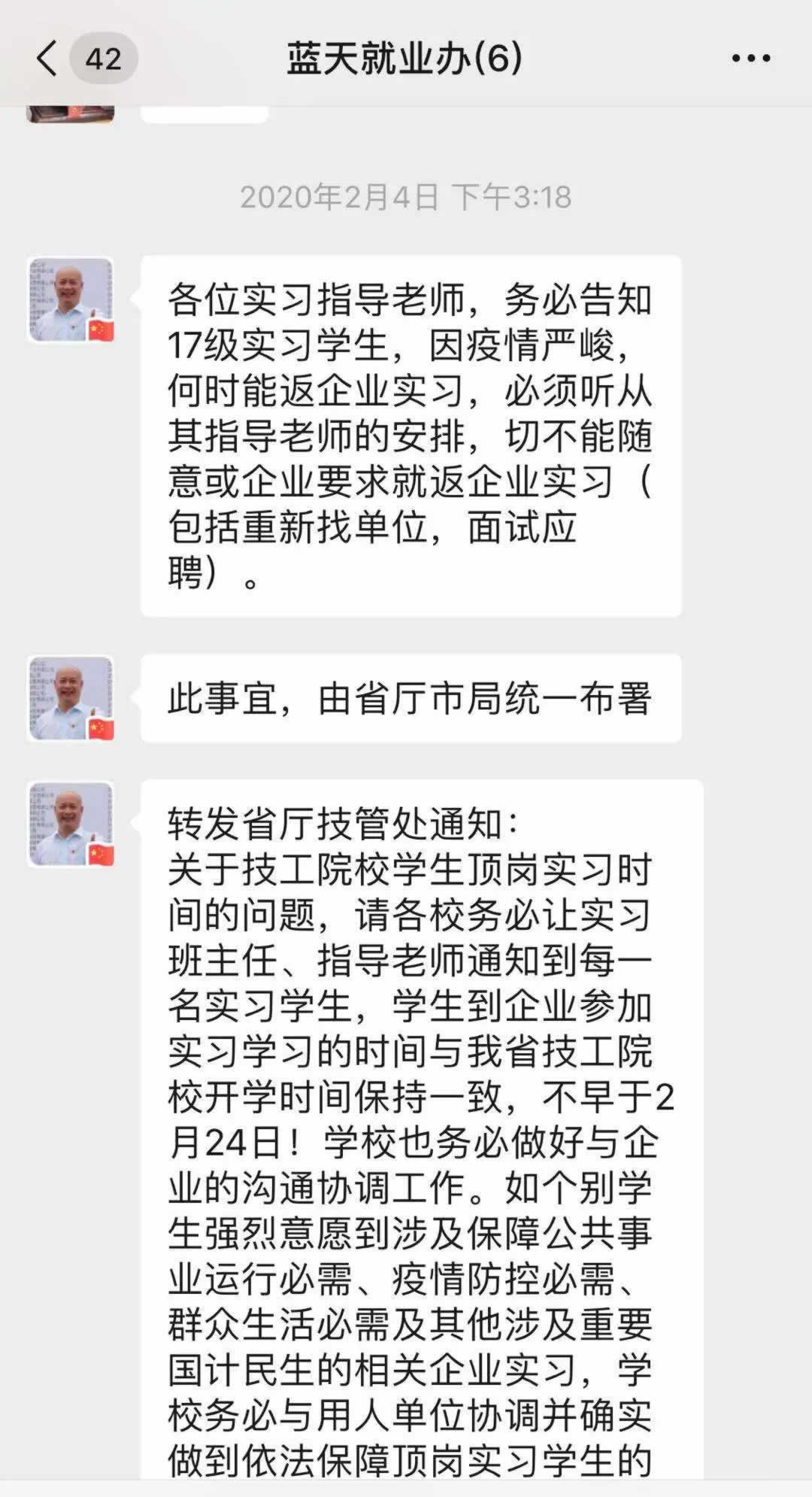 二是严格宣传教育,不留盲区。就业服务中心通过学生班级微信群、实习就业管理慧校通系统、QQ群、电话联系等多种途径,及时向顶岗实习学生、家长和企业传达省市局防控指导工作文件和学校最新防控工作要求,教育顶岗实习学生科学防疫,不外出、不聚会,不信谣、不传谣。