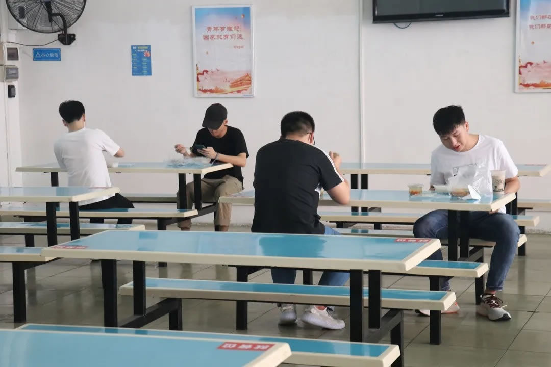 餐厅实施一人一米排队打饭,学生进行体温检测后,轮流洗手消毒后用餐。