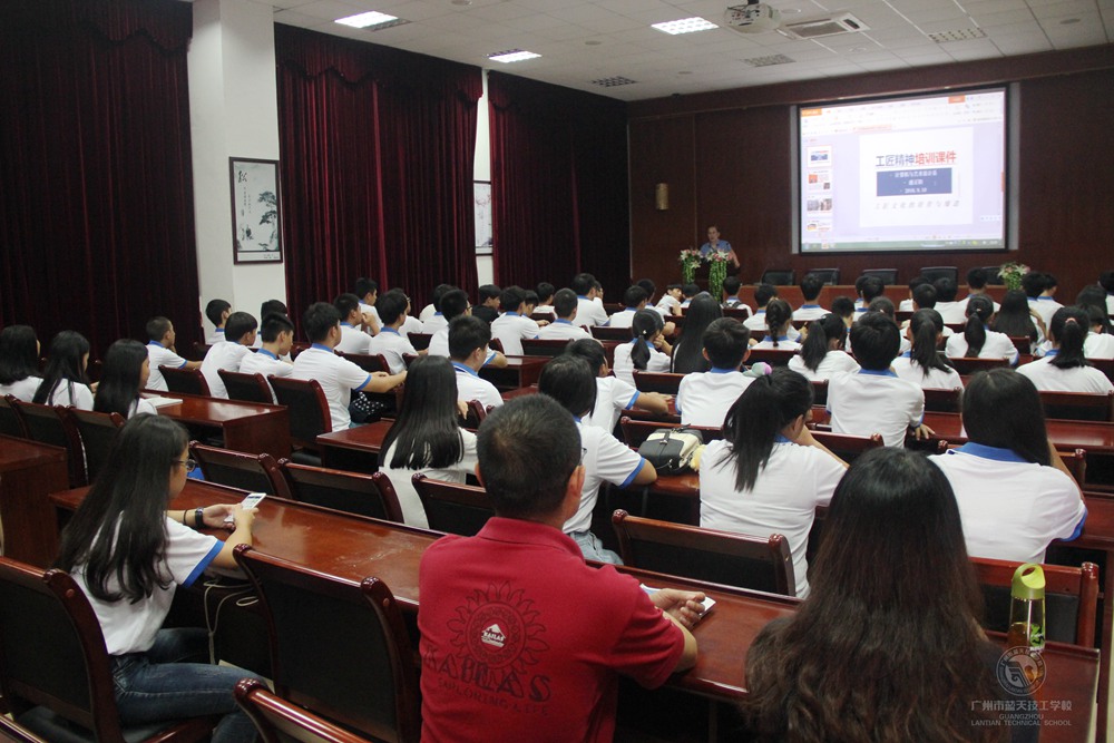 为弘扬工匠精神,营造综合育人、崇尚技能的校园氛围,广州市蓝天技工学校以《工匠精神读本》和《工匠精神故事汇》两本书为教材,在新生入学第一周安排了每班2个学时的时间举办专题讲座,培养学生践行工匠精神的自觉意识;同时开展组织观看《大国工匠》纪录片等活动。